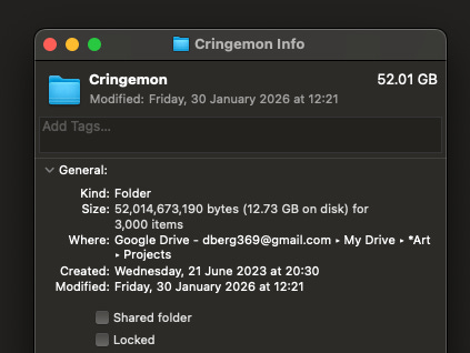 As you can see from the screenshot above - the project started in 2023 and contains over 3000 files, totalling 52GB of data. That’s roughly the same size as Grand Theft Auto V, The Dark Knight on Blu-ray, or 1/6th of the Epstein files. Topical.