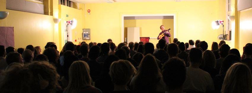 Audiences were not told the location. Just a secret meeting point. They were then led into the venue which tended to be somewhere strange - like a school assembly hall or a church back room2. It was like a secret society. Something audiences felt part of, all in on the joke of how ridiculous it was.